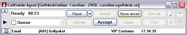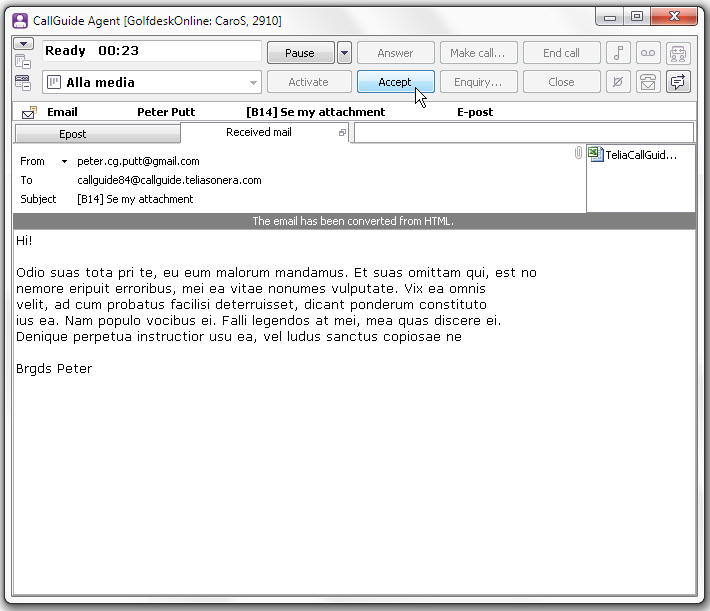 The Accept button flashes when an email contact with an email has been routed to you. If you have not specified in Client settings that emails shall be automatically accepted, you click on the Accept button to receive the email contact. Other options for receiving emails are to press F10 on your keyboard, or to select Contact handling | Accept from the main menu.