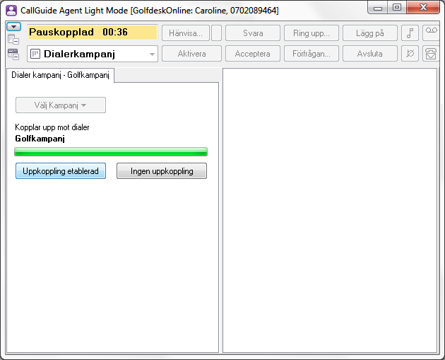 After this, you must not put down the receiver. A continuously connected call between ACE Dialer and your telephone extension is established in connection with the login. This call will be connected as long as you are logged in to the service for Campaign, dialer. ACE Dialer makes the calls to the customers and directs calls to you automatically. You cannot see the information about the current call before you have the customer on the phone, except when it is a personal campaign record.