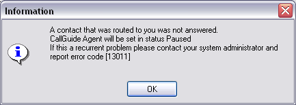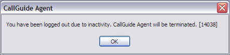 If you have been paused longer than a specified maximum time you can be automatically logged out from ACE Agent. The time before the so-called inactivity logout is executed varies depending on your selected activity. Inactivity logout is configured in ACE Admin. Should ACE Agent be shut down due to inactivity you get an information message.
